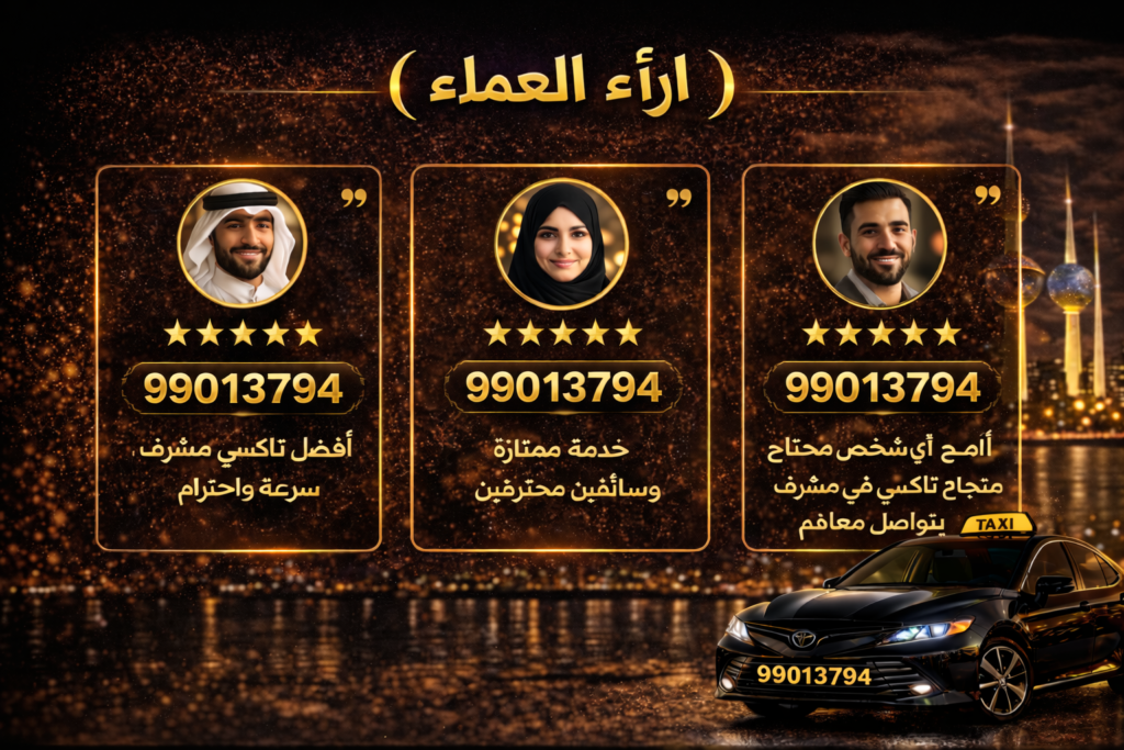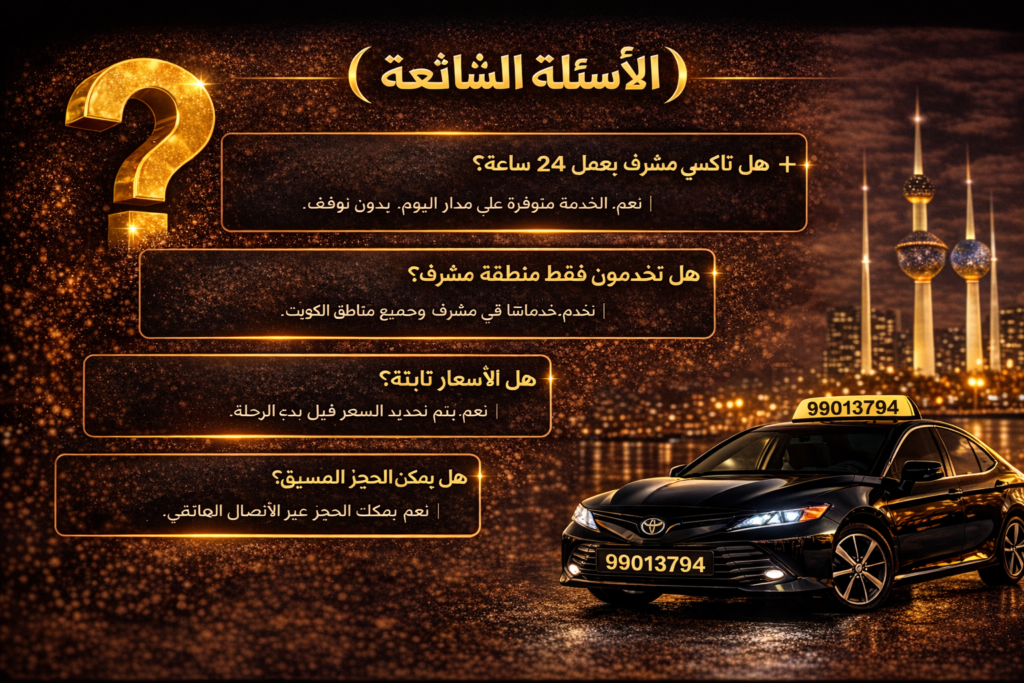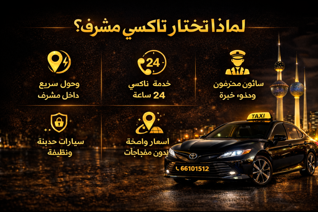 نوفّر في تاكسي مشرف خدمة توصيل سريعة وآمنة تغطي جميع محافظات الكويت على مدار 24 ساعة، بسيارات حديثة وسائقين محترفين وأسعار واضحة.